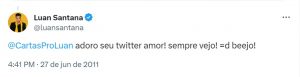 Nunca tive a chance de falar pessoalmente, os meus encontros com ele foram muito rápidos. Mas carrego uma alegria imensa de uma resposta que ele me mandou no Twitter, que dizia assim: @cartasproluan adoro seu twitter amor! Sempre vejo.